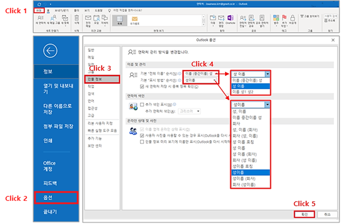 Outlook 한글 연락처 이름+성 바뀜 현상 수정